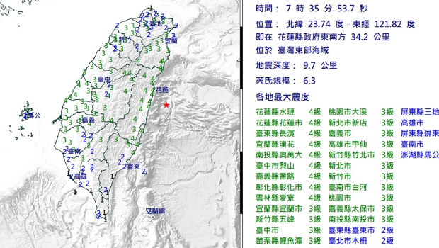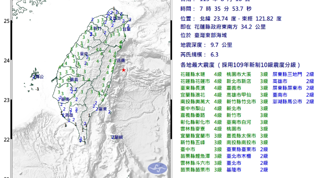 上午7點35分東部海域發生規模6.3地震,震央位于花蓮縣政府東南方34.2公里,深度僅10公里,屬于極淺層地震,最大震度在花蓮、臺東、宜蘭、南投、臺中、嘉義、彰化、云林4級,新竹、苗栗、桃園、臺北、新北、臺南、高雄3級,屏東、澎湖2級。