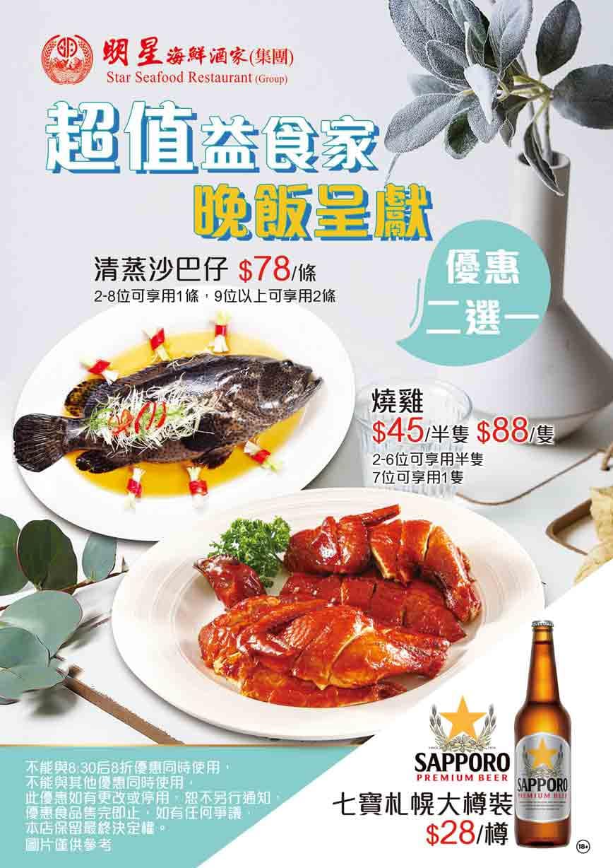 最近明星海鮮酒家再度推出吸引的晚市優惠,重點推介有“優惠二選一”,包括只需$78/條的清蒸沙巴仔,適合2至8位顧客享用,9位以上剛可享用2條。另一款可選菜式是燒雞,半只$45、全只$88,2至6位可享半只,7位以上可享用一只。