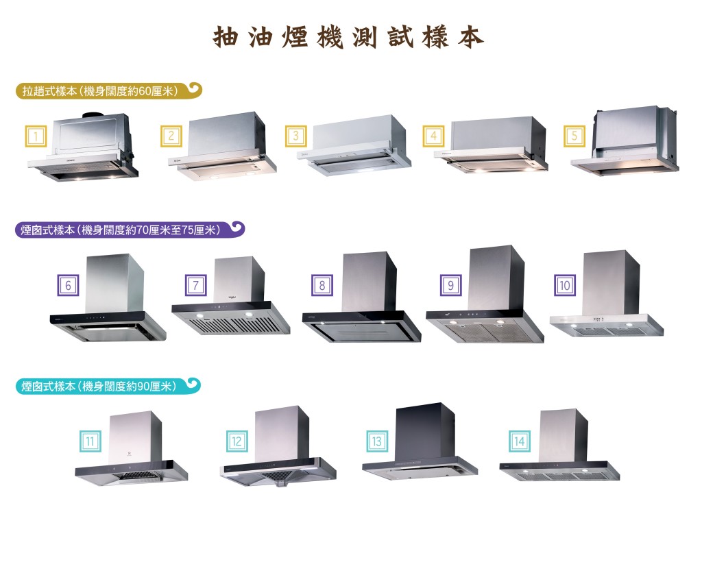消委會是次測試項目包括排氣量、風扇轉速、抽油煙、氣味及蒸氣能力、能源效率、寧靜程度、安全程度及使用方便程度。拉趟式樣本的售價由2,798元至18,000元,相差超過5倍;機身闊度約70厘米至75厘米的煙囪式樣本的售價由5,140元至5,980元;而機身闊度約90厘米的煙囪式樣本的售價則由4,680元至14,800元。