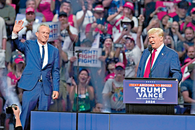▲特朗普和小羅拔肯尼迪上周五一同現身亞利桑那州的造勢大會。
