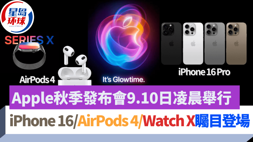 Apple剛發出邀請函,預告9月10日(二)凌晨舉行秋季發布會,主題為It's Glowtime,相信繼續以錄播形式進行,重頭戲當然是新一代iPhone 16系列,屆時同場現身的,盛傳還會有Apple Watch X系列智能手表及傳聞多時的AirPods 4、AirPods Max 2無線耳機,至于第11代iPad及iPad mini 7會否亮相,則有待當晚揭盅。