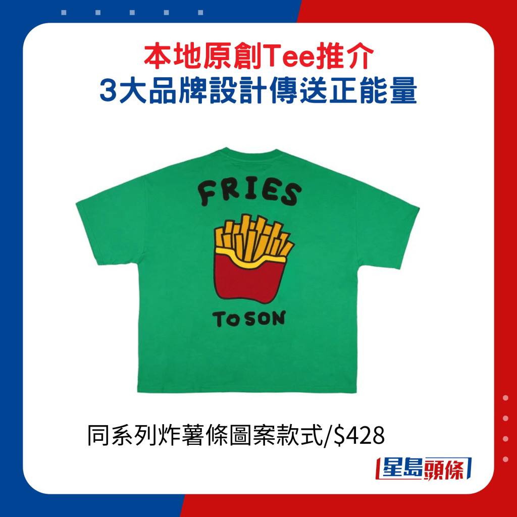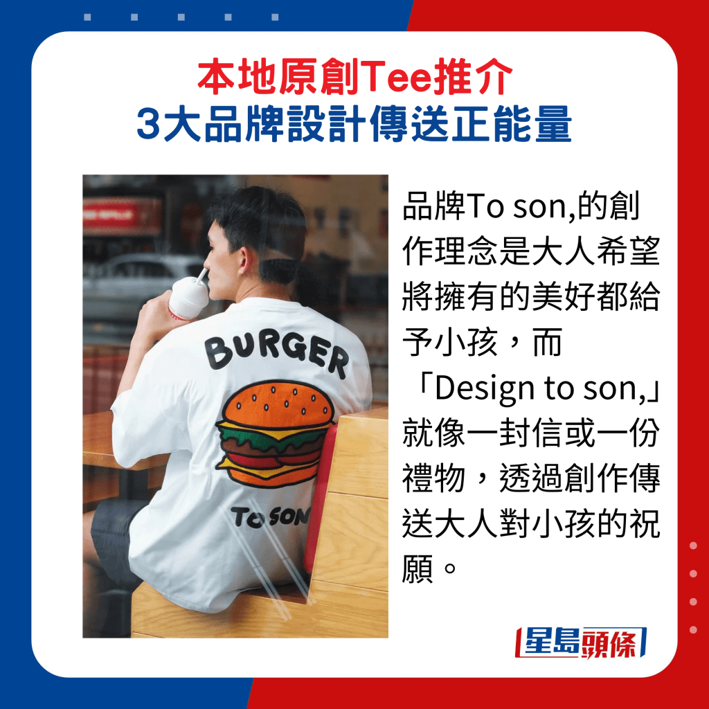 品牌To son,的創作理念是大人希望將擁有的美好都給予小孩,而“Design to son,”就像一封信或一份禮物,透過創作傳送大人對小孩的祝愿。品牌T恤的剪裁及選料以舒適為大前提,最新的Happy Meal夏季系列,靈感來自孩童兒時的美式快餐店,當中的美食作拼貼圖案,包括漢堡(Burger)、薯條(Fries)、班戟 (Pancake)及?扒(Meat)等,配搭鮮艷亮麗的色彩,展現稚氣活潑的風格。