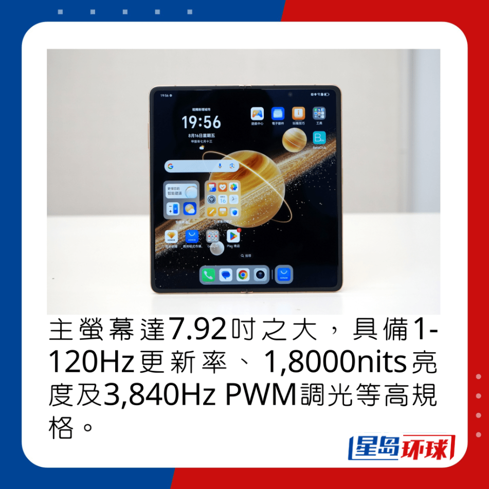 話說回來,Magic V3外熒幕及主熒幕分別為6.43吋OLED及7.92吋OLED,同樣擁有1-120Hz自適應更新率,值得留意的是外熒幕峰值亮度達到5,000nits,烈日下畫面鮮艷明亮,戶外拍攝不用擔心看不清畫面。雖然主熒幕峰值亮度只有1,800nits,日常煲劇、打機絕對夠用。此外,廠商一貫在護眼方面下工夫,如內置綠洲護眼技術,外熒幕及主熒幕分別擁有4,320Hz及3,840Hz PWM高頻調光。