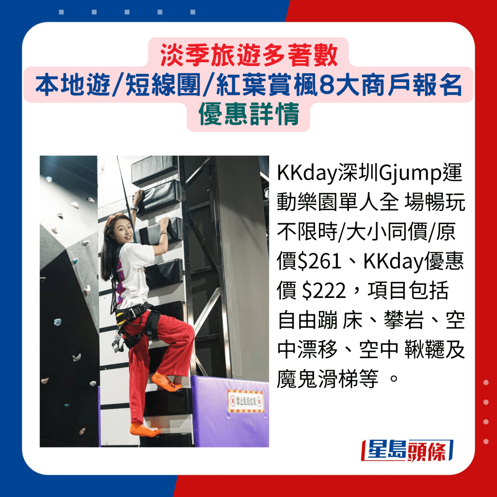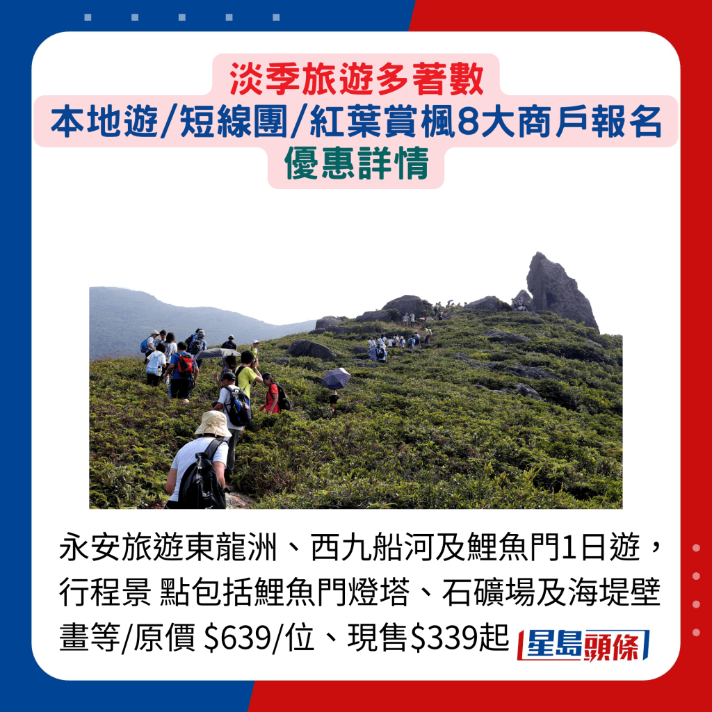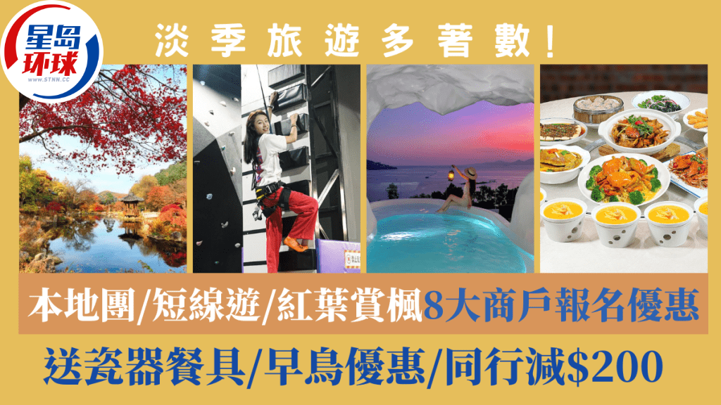 暑假旅游旺季結束,在淡季期間參加香港游及短線旅行團,尤其著數。除了個別網站提供專享優惠價之外,部分更可獲贈行李箱等不同禮品,抵上加抵!另有意欣賞紅葉盛放的話,多間旅 行社現正推出不同的報團優惠,趕快選定心水地點,相約三五知己同享旅游樂。