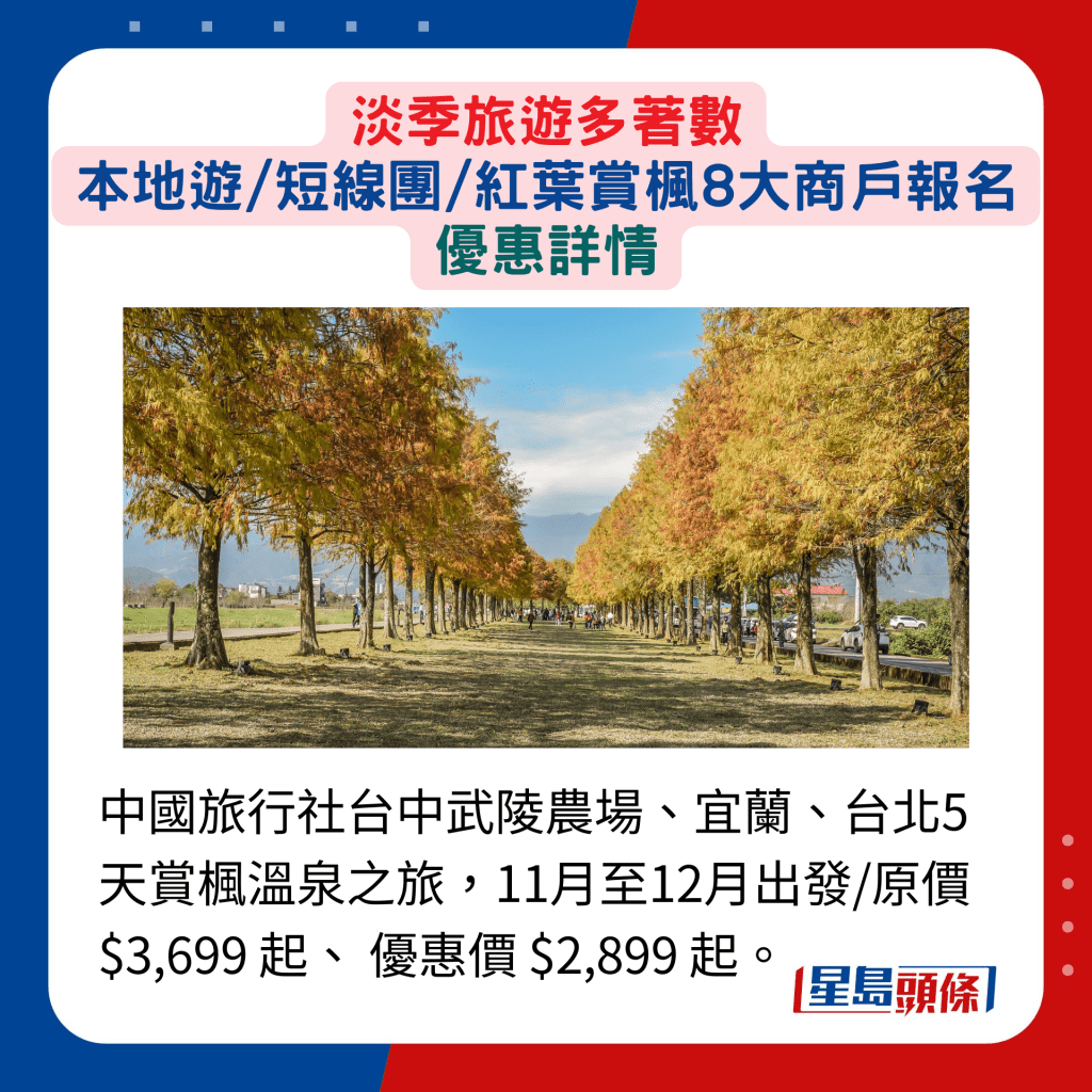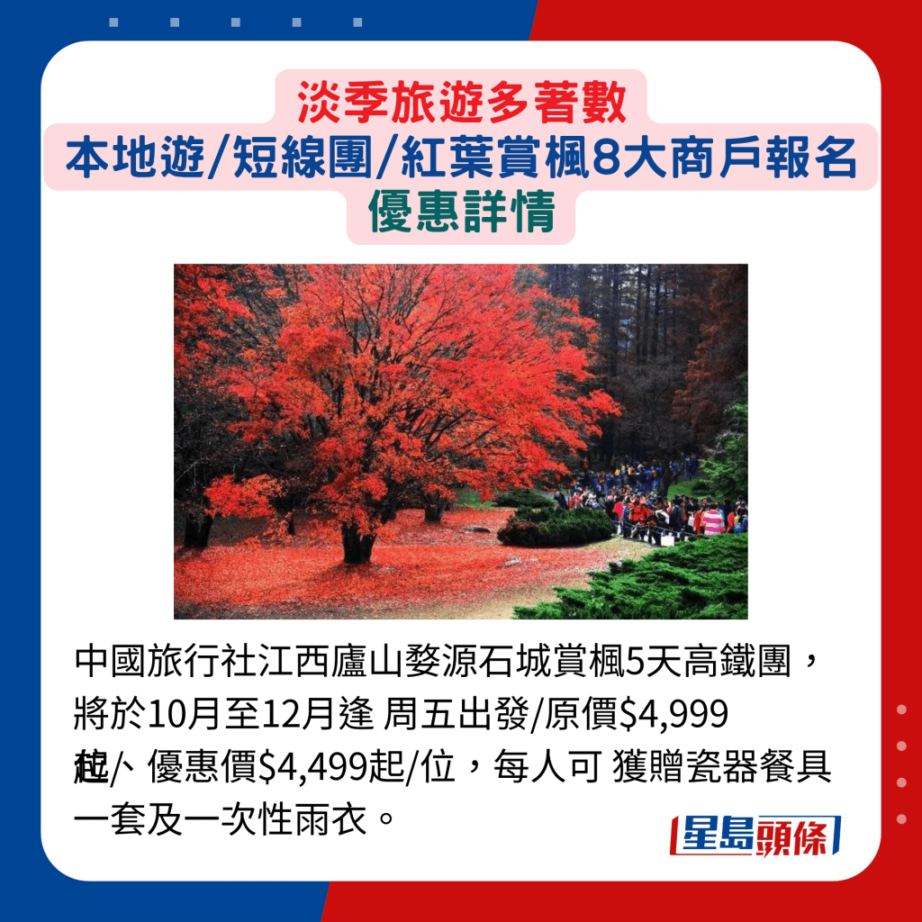 每年10月至11月是欣賞紅葉的黃金檔期,若有意參加旅行團,越早報名,著數越多。縱橫游提供多個日、韓的賞楓旅行團,熱門地區如韓國南怡島及日本 立山黑部等,均榜上有名,于網上報名并輸入指定優 惠碼“AP2024”,可因應報名與出發日期相距時間,獲得減價,團費最多可減$300。日韓以外,內地亦不乏 賞楓熱點,好像中國旅行社的江西廬山婺源石城賞楓5天高鐵團,行程包羅著名的婺源石城及廬山,團費每位原價$4,999起,現以優惠價$4,499起發售,參加者還可獲贈瓷器餐具等禮品,抵玩指數高!