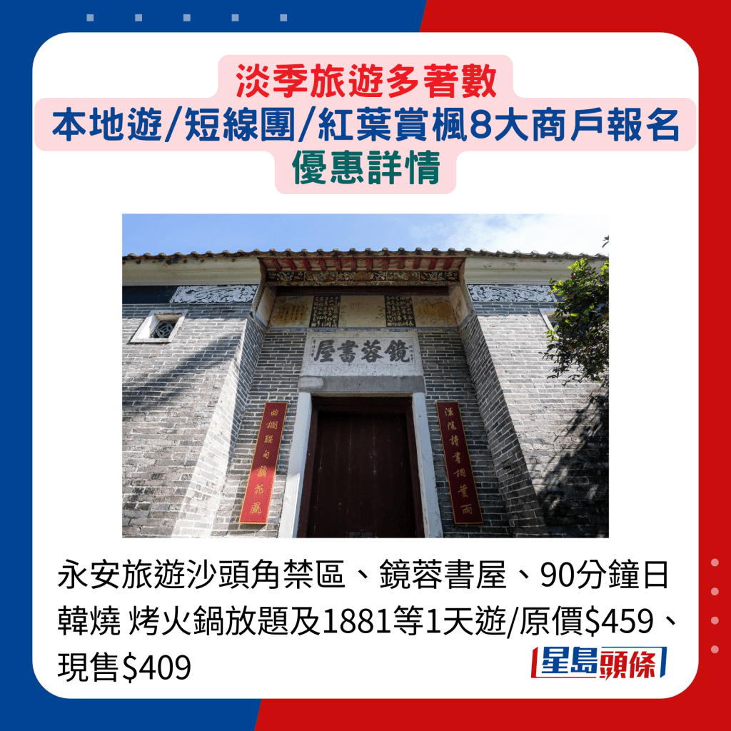 不想舟車勞頓,大可轉移目標留港香港游,樂趣與優惠兼備!最熱門必屬沙頭角禁區,永安旅游的一天游行程就包括沙頭角禁區、鏡蓉書屋及日韓燒烤放題等,團費原價每位$459,減至$409。至于新華旅游的“文化古蹟香港游.香港海防博物館之旅”,參觀海防博 物館外,還有AHIMSA健康素食自助餐及到訪中環大館, 參加者可獲贈迷你頭抽。