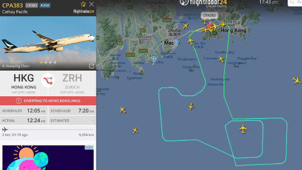 ▲國泰航空飛往瑞士的航班警告燈亮起,安全折返香港機場。(圖片來源:Flightradar24.com截圖)