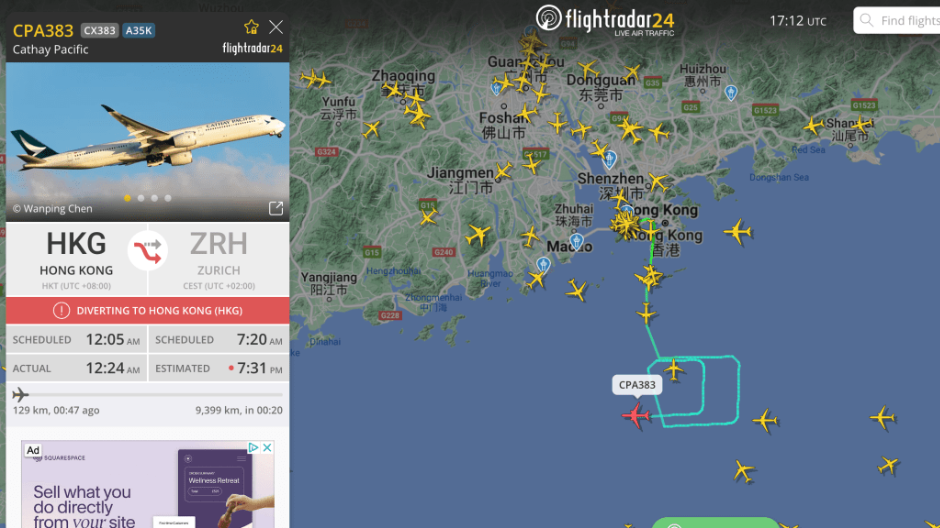 國泰航空飛往瑞士的航班警告燈亮起,安全折返香港機場。(圖片來源:Flightradar24.com截圖)