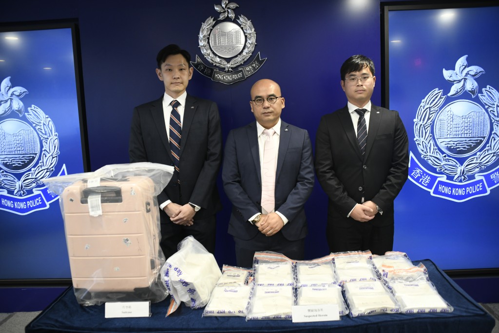 至于破獲“飛機豬”跨境販毒團伙方面,毒品調查科高級督察馮俊達表示,當日凌晨,探員在機場入境大堂內,截查并拘捕由馬來西亞回港的1男2女(19至24歲)。其中24歲姓殷女子相信為被招攬的“飛機豬”,警方在其行李內發現約10.5公斤共30塊懷疑海洛英。至于隨行的24歲姓張男子及19歲姓黃女子,則相信為負責監視的“監豬”。與此同時,警方亦在機場的士站截查拘捕一名31歲姓羅男子,及一名27歲姓曾女子,當中羅男相信是集團主腦。
