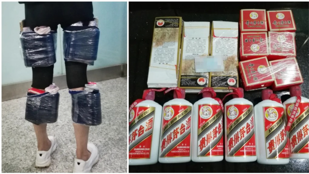 8月28日澳門海關發現一名香港女子腿綁6瓶茅臺酒企圖走私到內地后,中國海關今日表示,8月31日,又有一香港女子腿綁茅臺酒6瓶進境,被珠海拱北海關所屬閘口海關當場查獲。