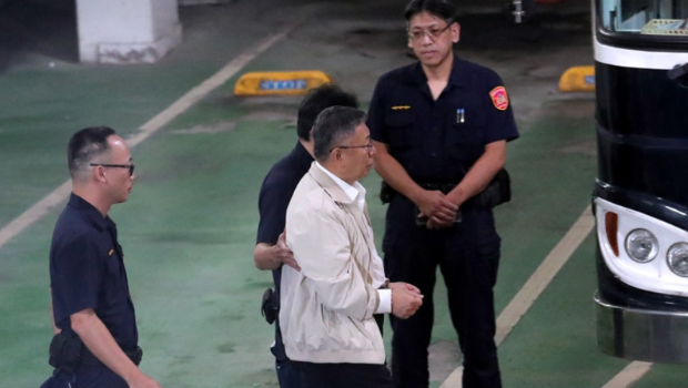 ▲前臺北市長柯文哲(穿白衣者)約于5日下午5時50分,被上銬押上囚車,移送臺北看守所。中時資料照
