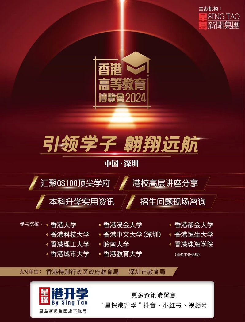 最權威的香港本科升學資訊!10月19日,星島新聞集團攜香港各大高校,在深圳舉辦香港高等教育博覽會,推介優質香港高等教育資源。名額有限,請點擊鏈接填寫資料,及早獲得參加機會。