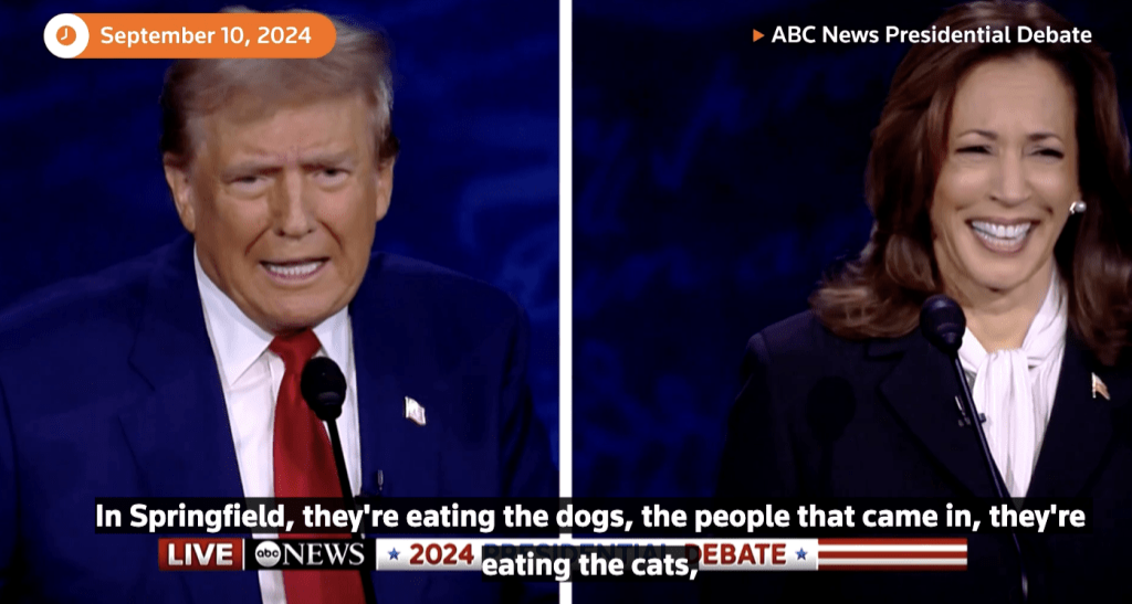 在周二的電視辯論中,當特朗普說完“他們在吃住在那里的人的寵物”,民主黨總統候選人哈里斯大笑起來又搖了搖頭,擺出一副無法相信的樣子。主持人亦表示,目前還沒有關于寵物受傷的可靠報告。特朗普則反駁說,他的確看過電視采訪,有人說他們的狗被帶走并被吃掉了。