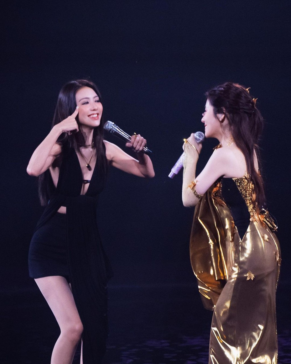 照片中,薛凱琪身穿一件黑色超低胸交叉綁帶背心配黑色短褲,同女星張碧晨手拖手同臺合唱。