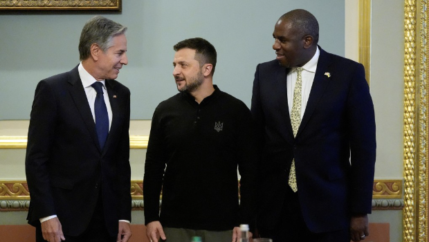 美國國務卿布林肯(左)與英國外交大臣林德偉(右)一起訪問基輔,與澤連斯基會面。 路透社