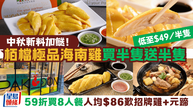臨近中秋,栢檔極品海南雞飯天后店會推出招牌去骨海南雞買半只送半只優惠,折扣后半只低至$49(原價$196/組),并同步推出多款優惠美食,包括以59折買肉骨茶,優惠后$39/份(原價$66/份);59折買6至8人派對美食餐(優惠價$688/份,8人平均$86/位,原價$1288/份),有極品去骨海南雞2只、鹵水元蹄 、秘制鹵燒豬頸肉、香煎手剁魚香肉餅 、小食拼盤2份、時菜2份、無味精靚湯/罐裝飲品/細肉骨茶8份等;食客亦可以75折購買$100現金券。