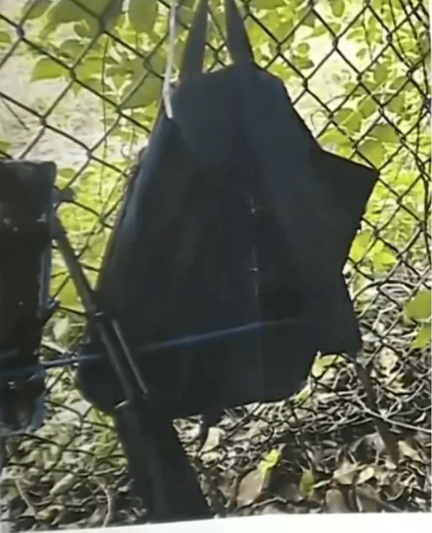 執法部門分享的照片顯示,兩個黑色袋子掛在球場外灌木叢中的鐵絲網圍欄上,槍支支撐在它們之間,并指向圍欄的縫隙。 GoPro 相機掛在旁邊的柵欄上。