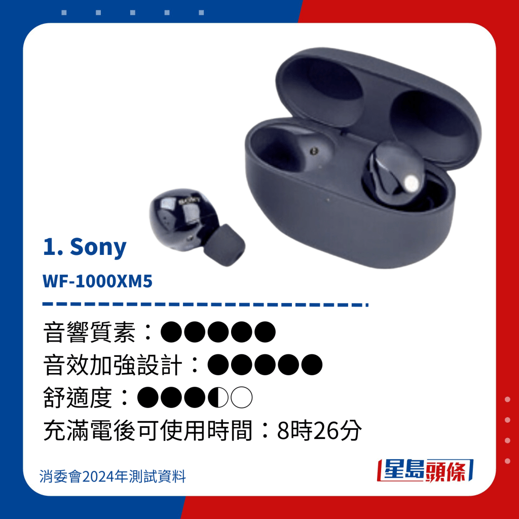 在真無線耳機的選擇中,“Sony”WF-1000XM5($2,490)在多項評比中表現優異,特別是其出色的音質和音效增強技術,使其成為最佳選擇,亦是在今次評測中,唯一一款獲5分滿分的耳機。