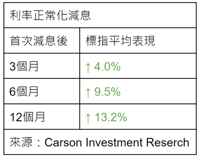 若聯儲局是進行利率正?;臏p息(包括1984、1989、1995及2019年),標指普遍表現不錯,在首次減息后3個月、半年及一年,平均升3.4%、9.5%及13.2%。