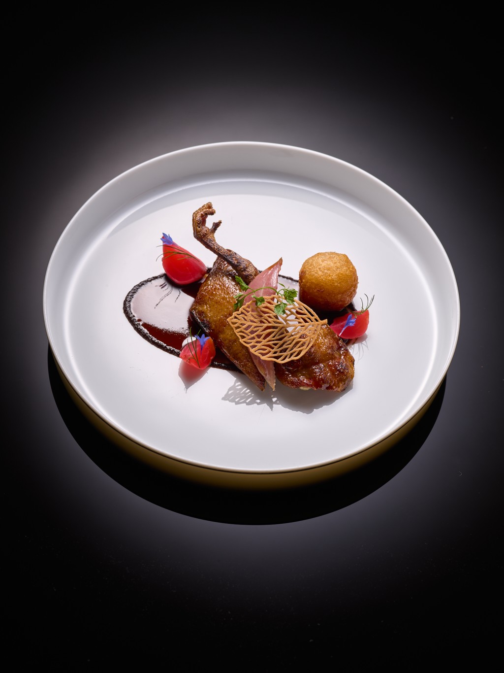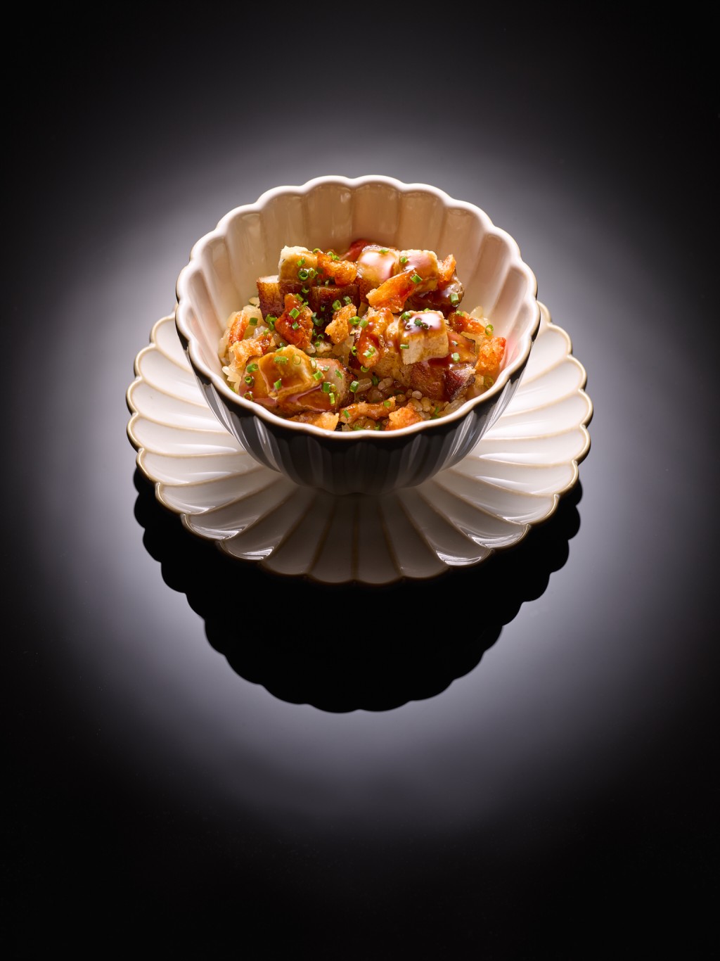 紅?魚他他薄切加入了煙魚骨慕絲、佛手柑和三文魚子,為魚肉增加清爽與口感,是很適合夏天品嘗的西餐前菜。炭燒和牛則選用澳洲M9級的牛腰脊肉,另伴上炸牛蒡、白蘿卜和鰹魚高湯烹調,肉質粉嫩及油脂鮮香。