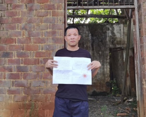 ▲張玉環手持無罪判決,返回日久失修的老屋。 (微博)