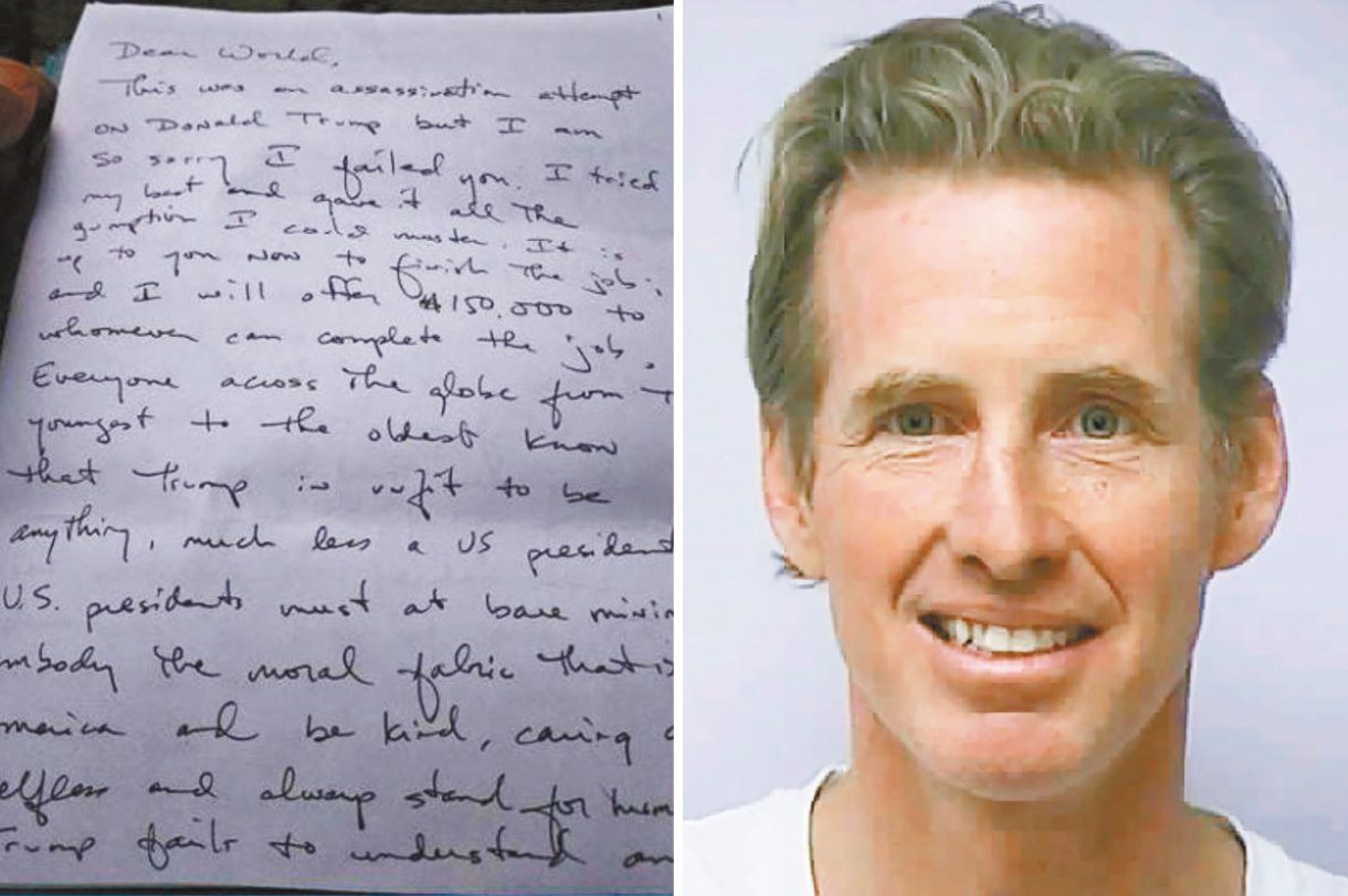 ▲檢察官指出,被捕男子勞斯一早已策劃今次行動,多月前已留下字條,顯示正計劃要暗殺特朗普。 合拼圖片