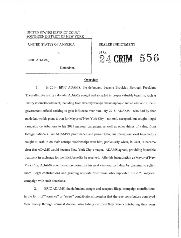 在檢方公布長達57頁的起訴書中,亞當斯涉及的控罪可追溯至2014 年,當時仍擔任布魯克林區長的他,接受了土耳其航空公司價值數萬美元的免費旅行,并只用了600美元便可享用伊斯坦布爾瑞吉酒店的豪華套房兩晚,遠低于實際費用7,000 美元。
