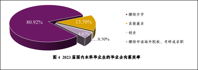 以2023屆本科畢業生為例:畢業生的整體去向落實率為95.13%,持續在高位保持穩定,屬國內高校前列;升學比例突破八成,達80.92%;升學畢業生主要以出國出境為主,美國為首要目標;升學院校水平不斷提升,21.70%的升學畢業生攻讀世界大學排名前10名高校的學位,71.55%攻讀世界大學排名前50名高校的學位就業薪酬平均年薪為17.08萬元人民幣;畢業生的就業地點和單位性質更加多元,足跡遍布各地各類優質企業。香港特區IANG工作簽證的適用范圍拓展至港中大(深圳),就業面更廣泛;選擇前往國有企業的比例同比上漲12.38個百分點。