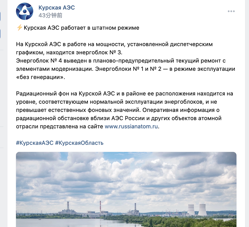 庫斯克核電廠官方賬號聲明。(翻攝自VK)
