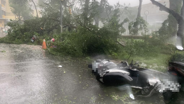 ▲高雄市三民區大中一路口巷行道樹和機車被吹垮,數輛機車被壓在樹下。中時網