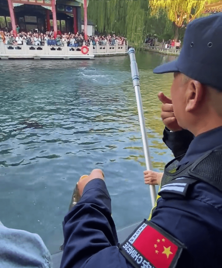 景區保安手持死魚,苦口婆心地勸阻游客:“大家千萬不要喂魚,已經撐死好幾條了,不要屠殺生靈!”