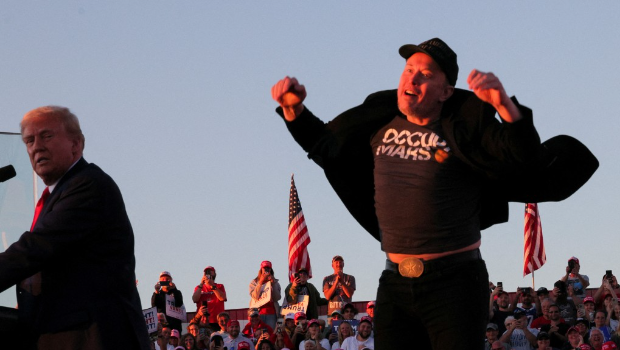 馬斯克在臺上跳躍,熱烈支持特朗普。路透社