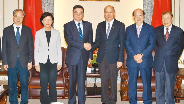 ▲原訂4日由韓國瑜作東的朝野和解飯,因臺風擾局決延期。圖為卓榮泰(左三)拜會韓國瑜(右三)。中時資料照片