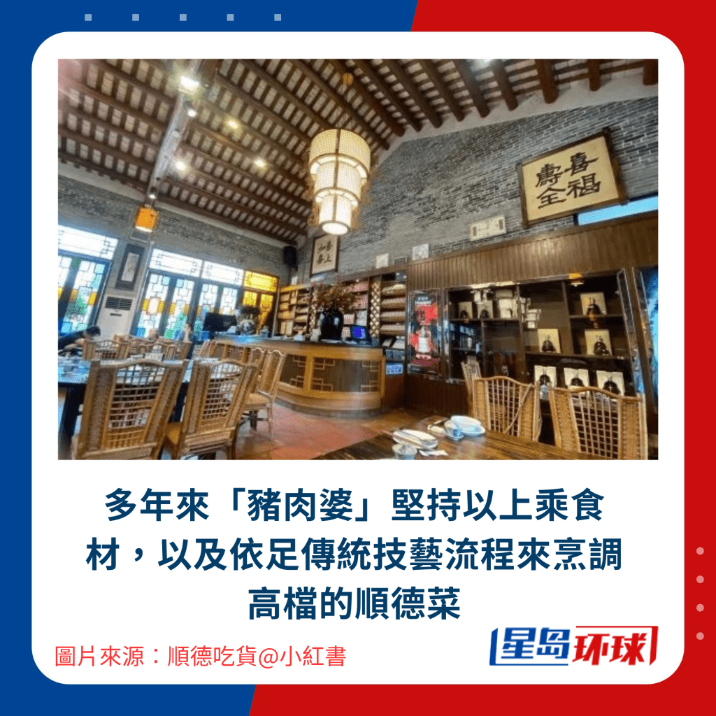 多年來“豬肉婆”堅持以上乘食材及依足傳統技藝流程來烹調高檔的順德菜,對菜式出品、環境衛生及服務非常嚴格,就連鋪面裝修也講究,是走嶺南園林風格,一室青墻紅地磚、小橋流水,還有魚兒在水中游,古樸別致。而其招牌菜就有銀杏胡椒豬肚湯、燒鵝、缽仔柚皮、撈起魚生、美極干煎羅氏蝦等。
