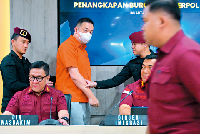印尼當局10日召開記者會,宣布被中國通緝的林強(橙衣者)落網。