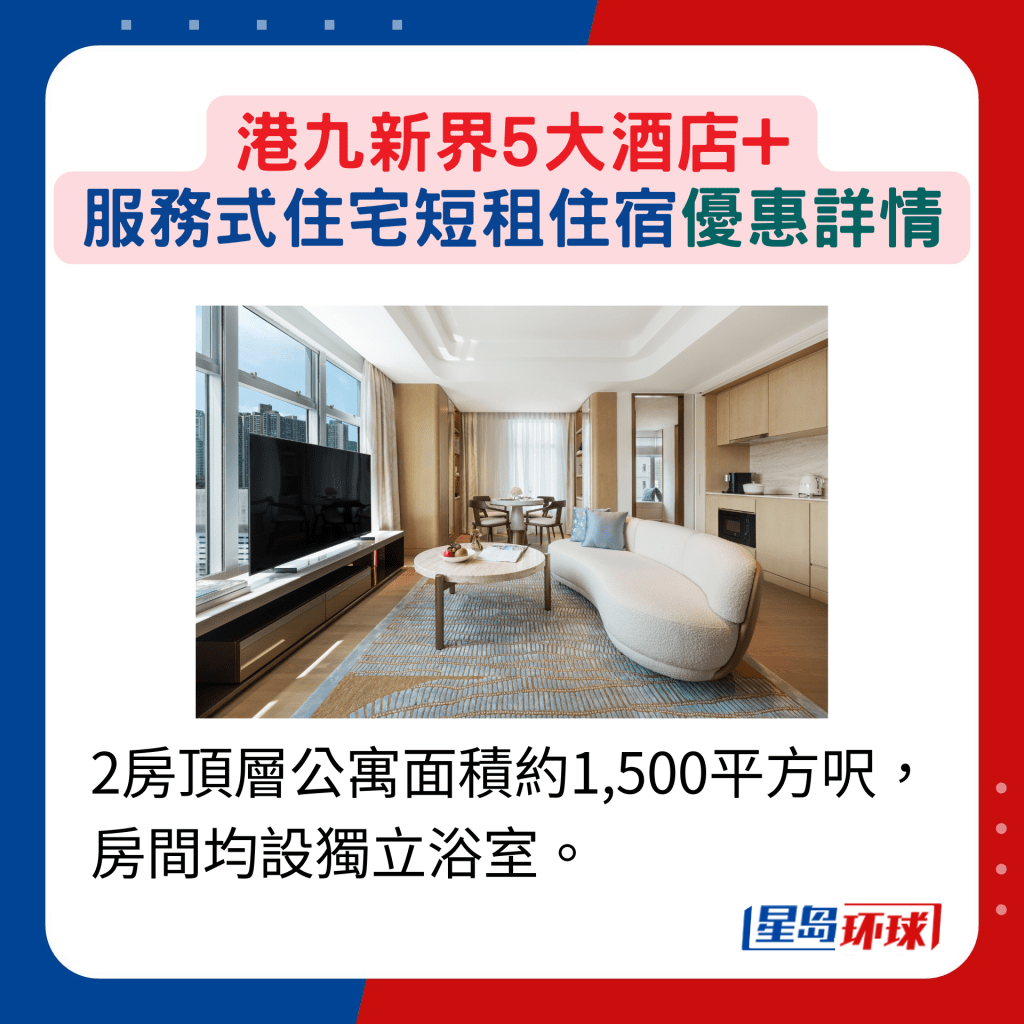 2房頂層公寓面積約1,500平方呎,房間均設獨立浴室。