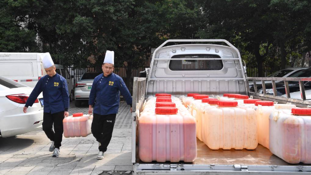 ▲成都一家環??萍计髽I收集餐廳廢油轉供提煉為生質燃油。(圖/新華社)