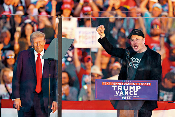 ▲馬斯克10月5日在賓夕凡尼亞州,亮相特朗普的造勢集會。