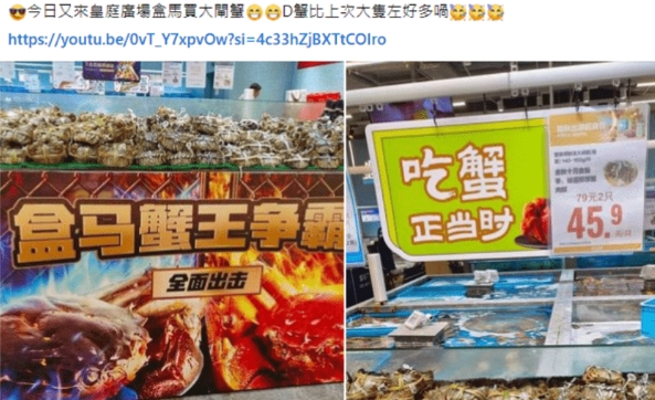 中秋過后,又是食大閘蟹的好時機。去年吸引大批港人涌去深圳搶購大閘蟹的盒馬鮮生超市,亦都開始賣大閘蟹了!日前有網民在facebook群組“深圳吃喝玩樂資訊關注組”上發文,分享在皇庭廣場盒馬購買大閘蟹的體驗。場內賣的大閘蟹每只約重115克至210克不等,售價最平低至¥69/4只,亦有¥99/4只、¥79/2只及¥88/2只等,比香港零售店便宜很多。