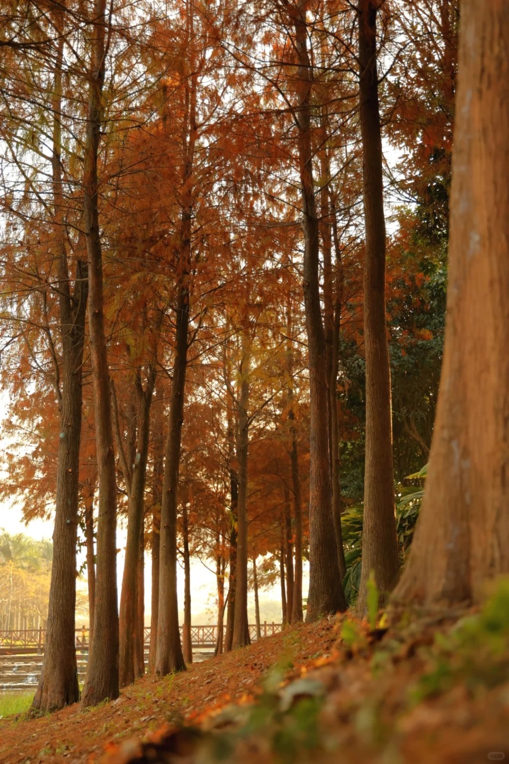 位于湖畔及小橋旁的一排落羽松(圖片來源:小紅書@糖衣)