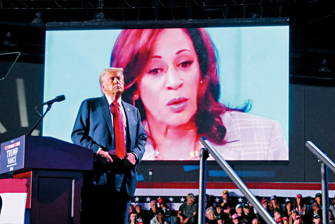 ▲特朗普上周五在密歇根州底特律造勢時,屏幕播出哈里斯的面容。