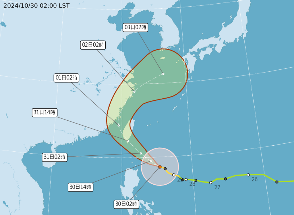 氣象署今晨5點半發布陸上臺風警報,依目前路徑來看,康芮預估明天中午前后從臺東登陸。(中央氣象署提供)