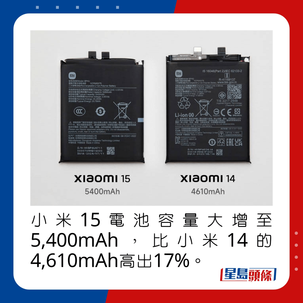 多得Snapdragon 8 Elite的雙超大核及PC級架構,加上加碼至12GB RAM起跳,配合自家HyperCore加持,CPU效率大幅提升,長時間玩大型游戲亦可保持高幀率及低功耗。效能以外,小米15另一重磅升級是金沙江電池能量密度提升至850Wh/L,令電池容量由小米14的4,610mAh大增至5,400mAh,加上HyperOS 2優化,續航力較上代提升23%,且支援90W有線及50W無線快充。