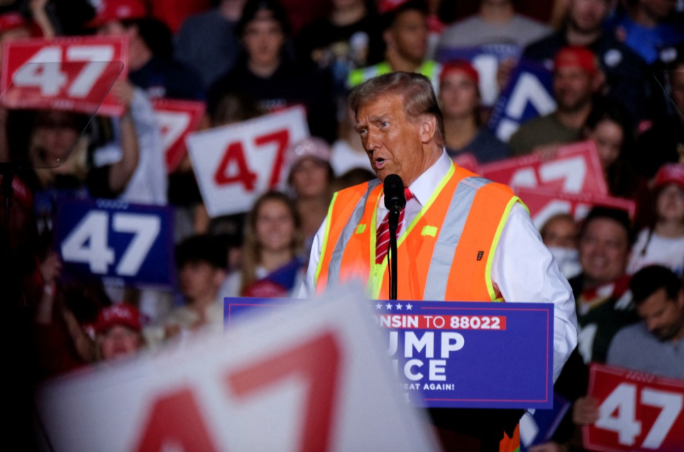 特朗穿著橙色反光背心出席造勢大會。路透社