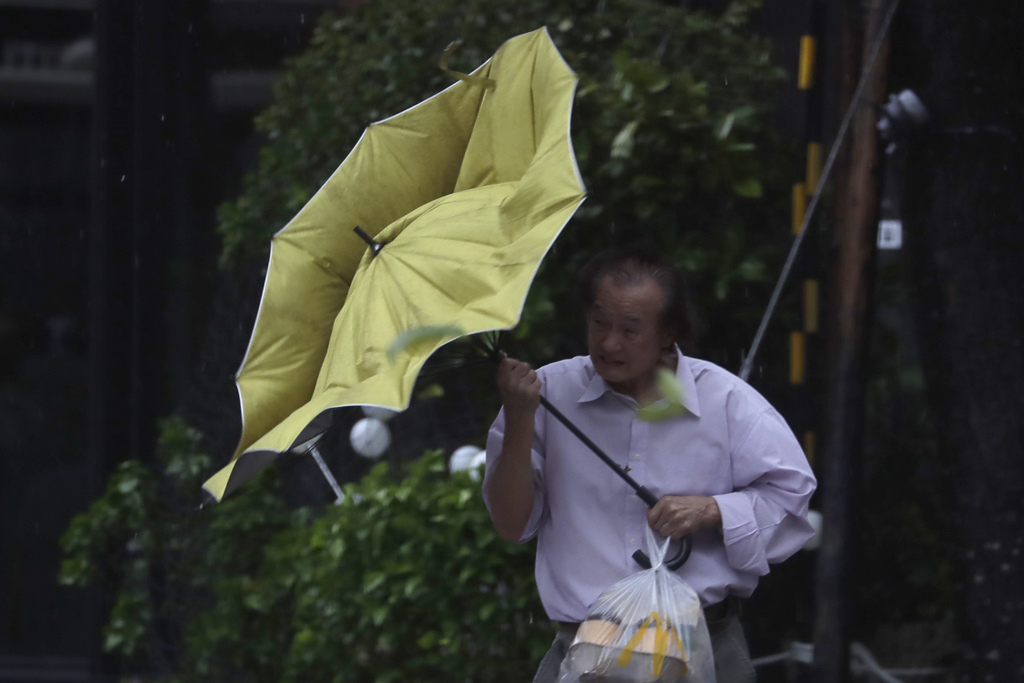 ▲強臺“康妮”31日午后在臺東成功登陸,風強雨驟全臺有感。圖為臺北街頭行人雨傘被強風吹到開花的瞬間。(美聯社)