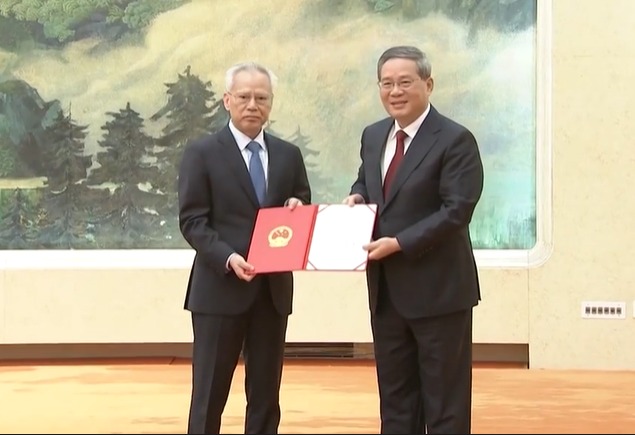 國務院總理李強(右)向岑浩輝(左)頒發了任命他為中華人民共和國澳門特別行政區第六任行政長官的國務院第794號令。