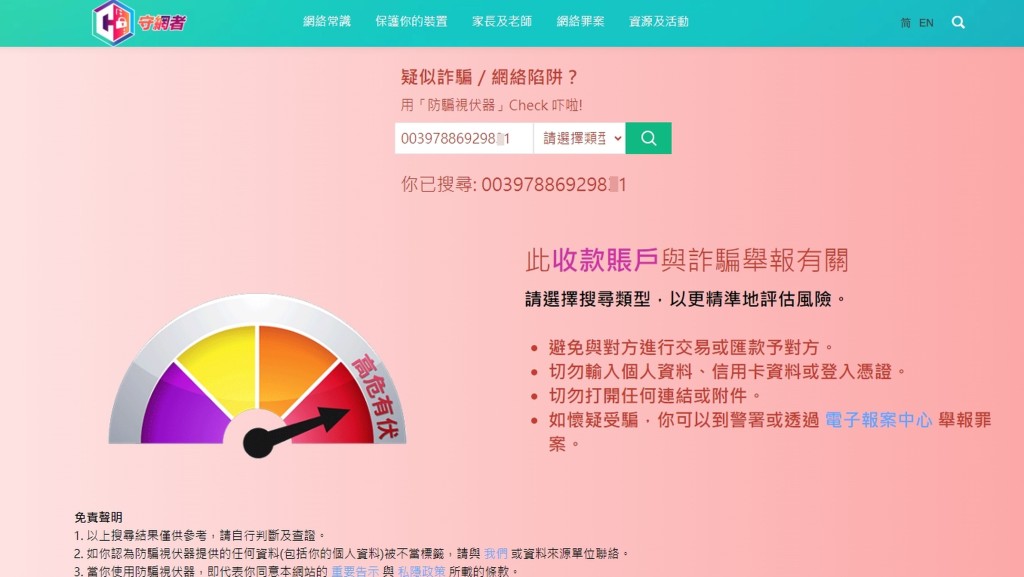 警方“守網者”網頁的“防騙視伏器”( https://cyberdefender.hk/ )可輸入相關資料查閱是否曾涉及詐騙的舉報,記者于是輸入苦主提供的兩個收款賬號,結果均顯示“高危有伏”,但輸入“蟹X”騙徒提供給記者的賬號則顯示“未有紀錄”,相信是使用不久的傀儡戶口。