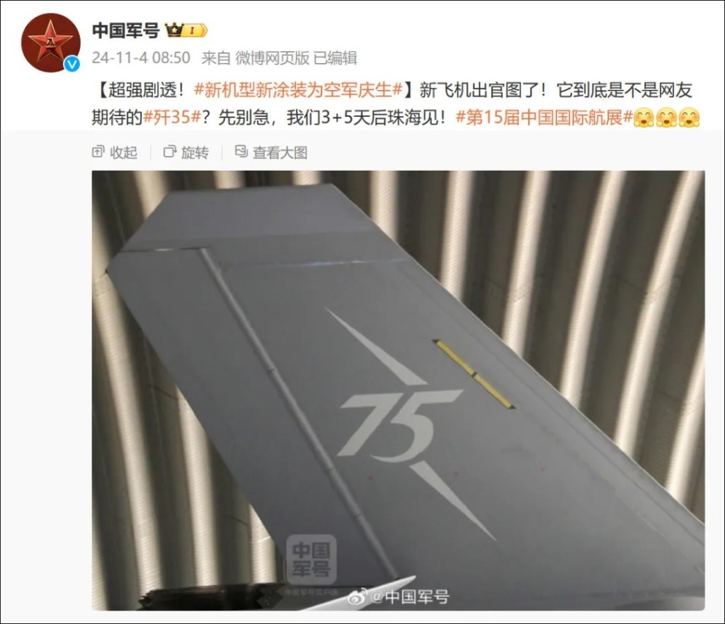 11月4日上午,中國軍方官方微博“中國軍號”發布的一則消息引發網友熱議。文案中寫道:“新飛機出官圖了!它到底是不是網友期待的殲35?先別急,我們3+5天后珠海見!”