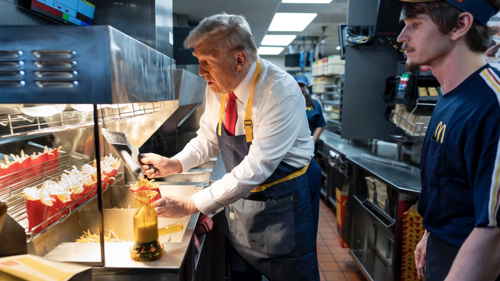 ▲特朗普日前“扮工”拉票親自炸薯條。 美聯社