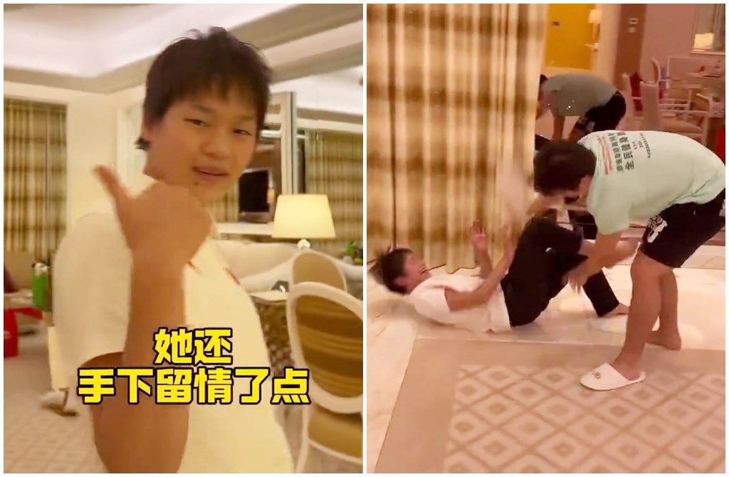 但說時遲那時快,全紅嬋突然朝王宗源左臉頰呼了一巴掌,王宗源發現上當被整后,立刻追著全紅嬋要“報仇”。只見他手持拖鞋朝倒在地上的全紅嬋“狂打屁股”,全紅嬋也立刻跟拍攝者“謝哥”謝思埸求救。影片結束前,她展現私下搞怪一面,立刻把走道當成伸展臺在走,最后對著鏡頭擺出讚的手勢,逗得在場所有人哄堂大笑。
